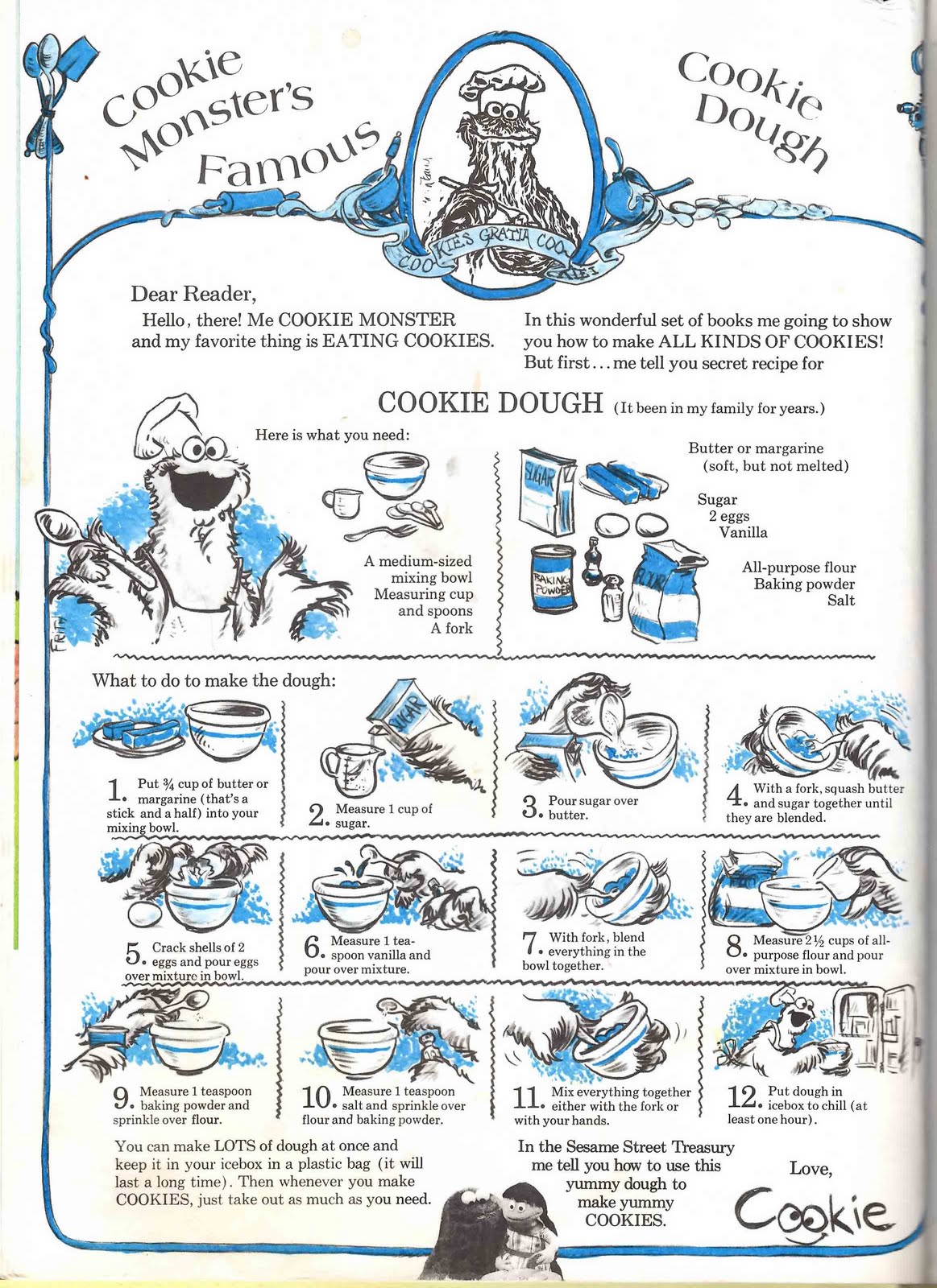We all know Cookie Monster loves to eat cookies, but it turns out he's quite the baker, too! Cookie Monster's famous cookie dough recipe first appeared in Big Bird's Busy Book, from the 1970's. If you like a bit of nostalgia mixed in with your sugar and eggs, this recipe is for you: