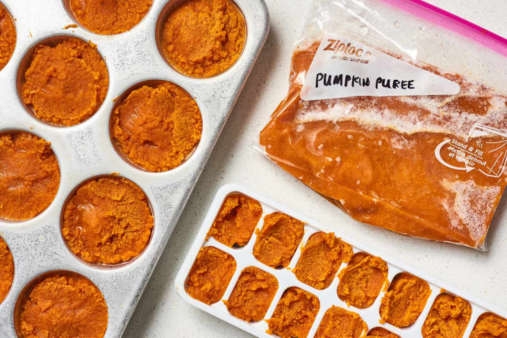A can’s worth of pumpkin purée is about 15 ounces by weight, which fits perfectly inside a quart-sized zip-top bag. Freeze the bags flat on a baking sheet and you can then store them upright like a file. These flat bags thaw easily at room temperature, or you can quickly thaw them in the microwave. We use this portion most for baking pumpkin bread and pumpkin pie.