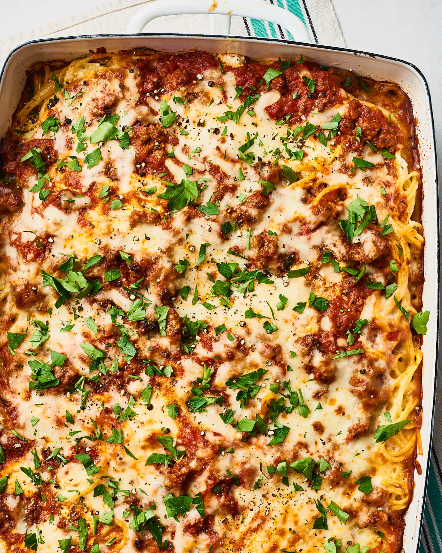 The spaghetti bakes for 30 minutes covered, which keeps things moist while the eggs set. You’ll then uncover and bake for 10 to 15 minutes more, or until the whole thing is bubbly and the cheese is browned. Just after baking, let the casserole cool for five minutes before cutting into slices and serving.